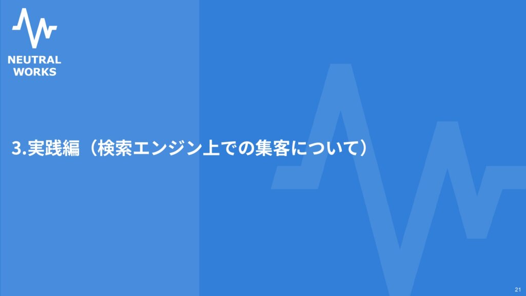 検索エンジン上での集客について具体的な実践方法の解説に移ります。