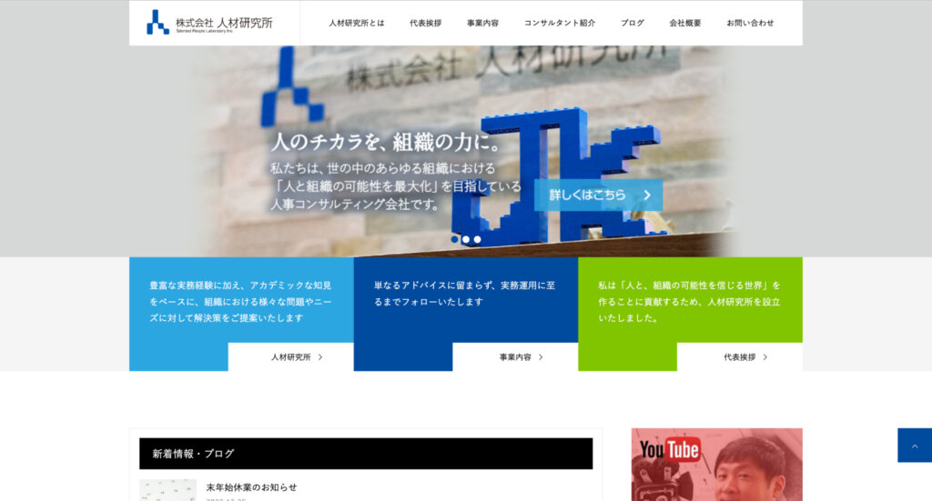 人材研究所 新井様:以前のホームページは、作った当初から長年そのままになっていました。いわば「飾り」のような状態で、私たちの強みやサービス内容が正しく伝わっておらず、採用ページもない。 せっかくサイ トがあるのに、ビジネスに全く活用できていなかったんです。ちょうどロゴを変更するリブランディングのタイミングも重なり、サイトをきれいにして、そこから相談が来るような仕組みを作りたいと考えました。