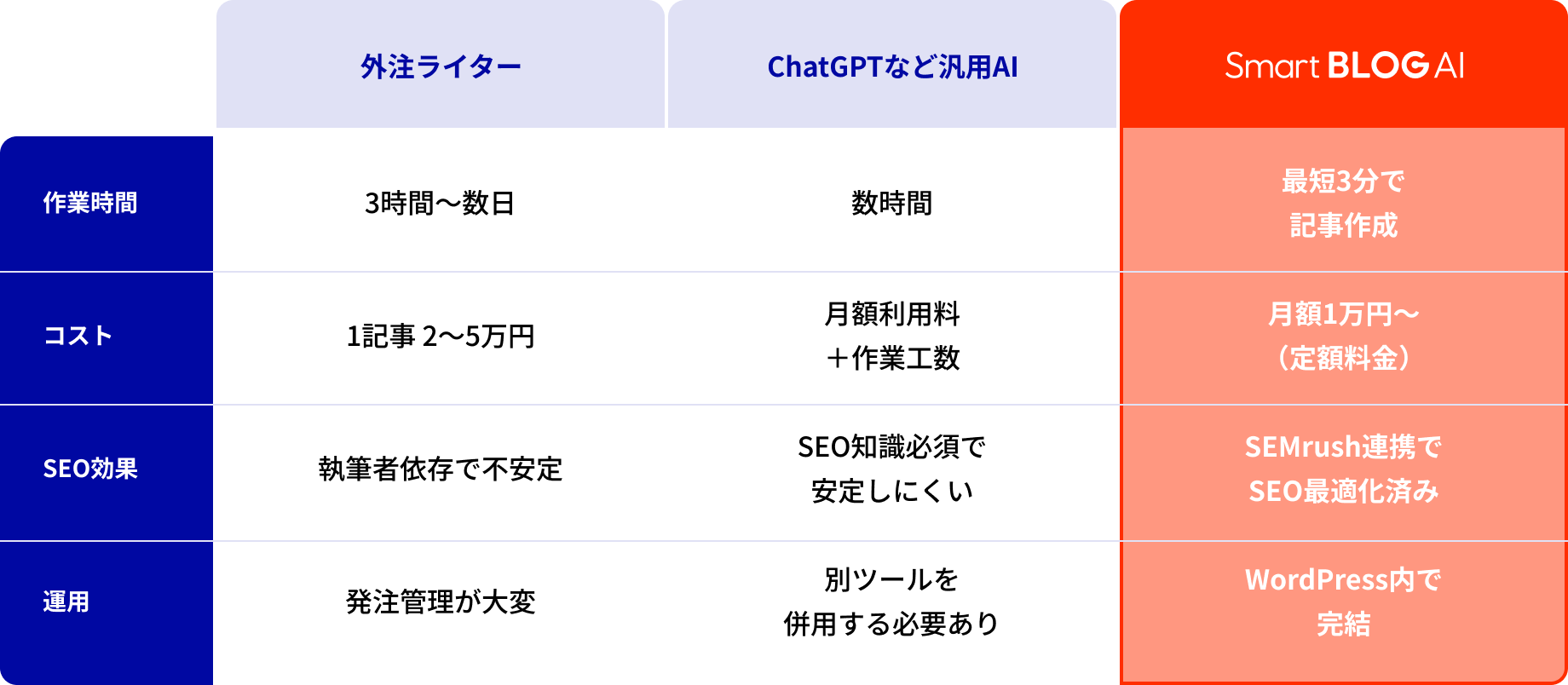 SEO記事制作の方法はいくつかありますが、外注や汎用AIツールを使う場合は「コスト」「時間」「品質」のいずれかに不安が残りがちです。 Smart Blog AIなら、SEO実績に基づいた記事構成とWordPress完全連携によって、低コスト・短時間・高品質を同時に実現できます。