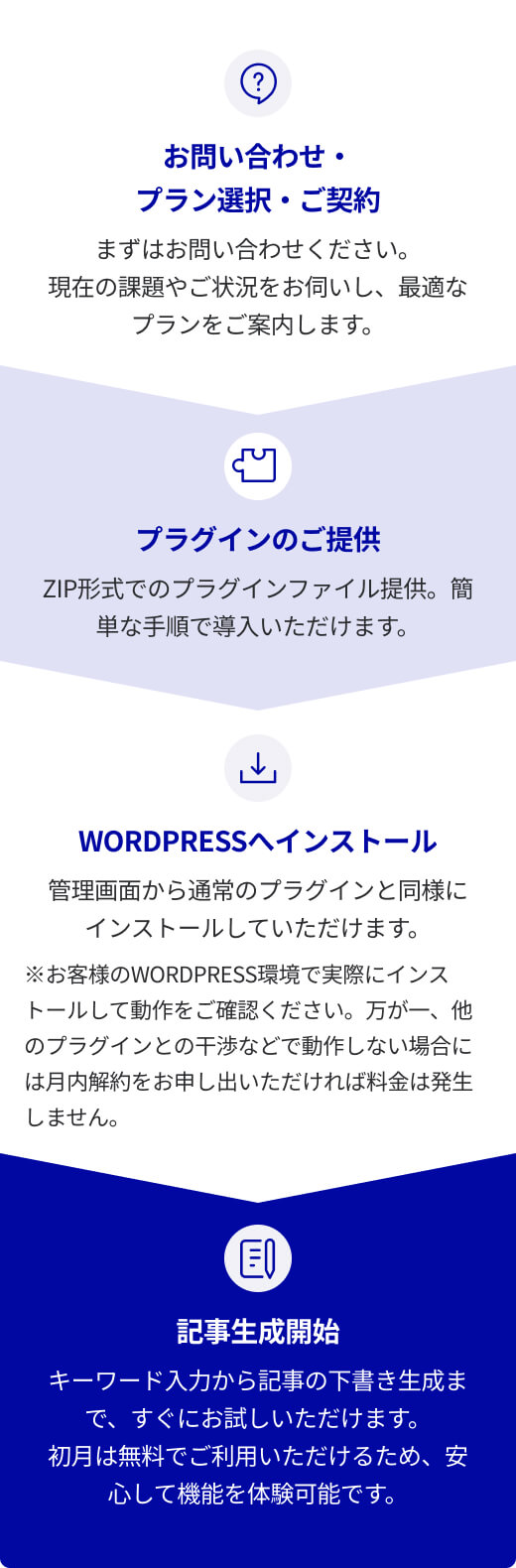 はい。SEOの専門知識がなくても、WordPress上のステップ操作で記事を自動生成できます。構成案やタイトルもAIが提案するため、初心者の方でも簡単に使えます。
