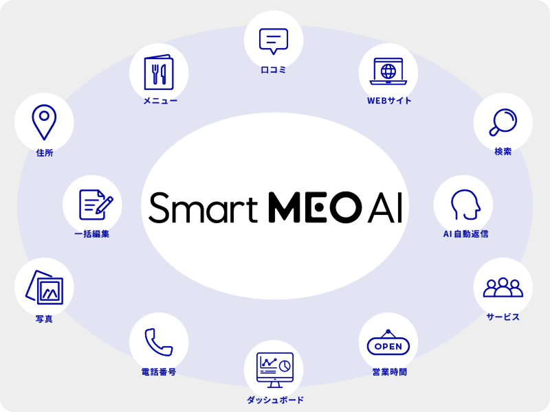 Smart MEO AI は、店舗ビジネスの集客に必要な要素を "AI × 自動化" でまとめて提供。