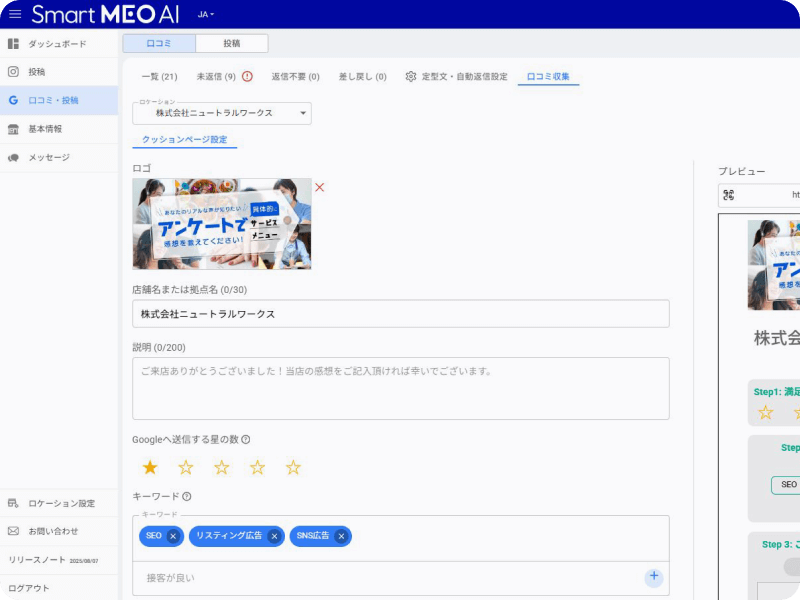 クッションページ機能により、高評価レビューを自然に集められます。ユーザーは星評価を選ぶだけで、AIがレビュー文を生成。