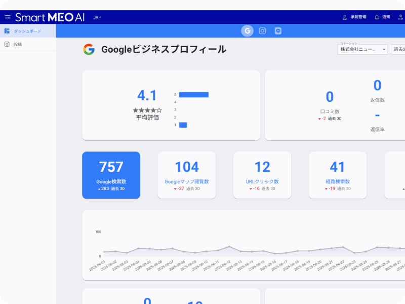 経路検索数・電話発信数・口コミ数など、来店につながる行動を一目で把握。ロケーション切替もワンクリックで可能、複数拠点でも管理が簡単です。