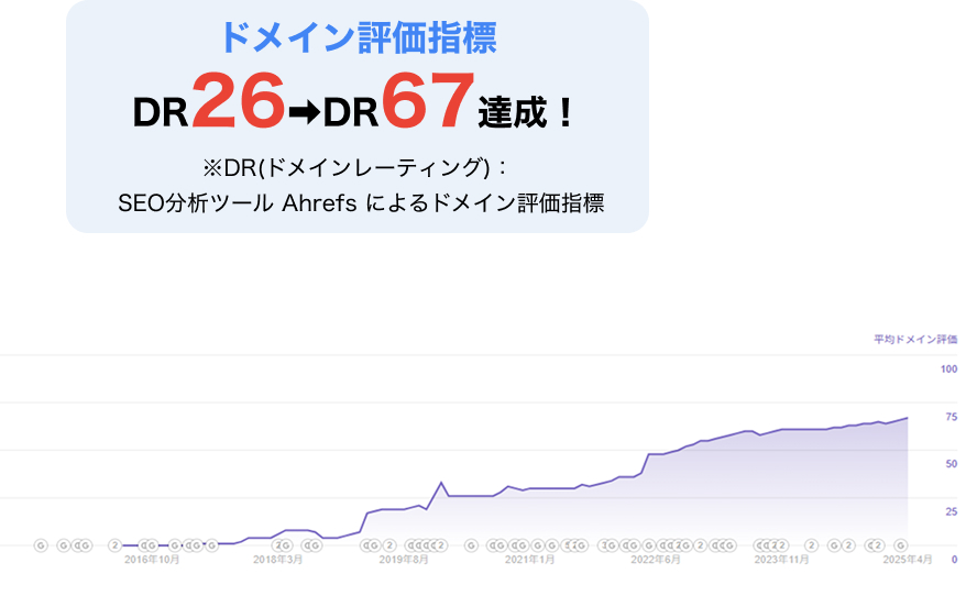 当社はドメインの評価は、Ahrefs社が提供するDR(ドメインレーティング)と自社独自指標を使用します。DR・自社指標ともに全サイトを1-100までの相対評価で表した数字となります。